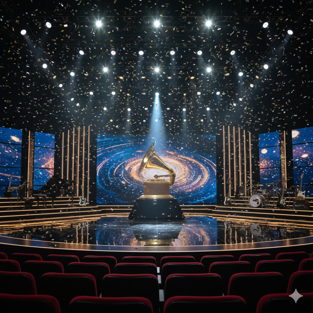 Sahnenin ortasında büyük bir Grammy ödülü heykeli duruyor. Işıklar sahneyi aydınlatıyor ve arka planda müzik aletlerinin siluetleri görülüyor. Genel atmosfer gösterişli ve heyecan verici.