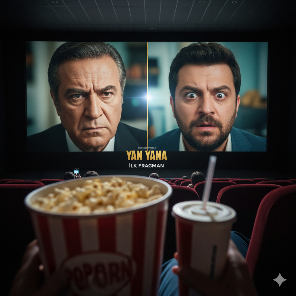 Bir sinema perdesinde oynayan bir film fragmanından bir sahne. Ekranın önünde patlamış mısır ve içecek tutan iki kişinin eli görünüyor, yüzleri görünmüyor. Fragman sahnesi, Haluk Bilginer’in ciddi bir ifadeyle baktığı, Feyyaz Yiğit’in ise şaşkın bir şekilde ona baktığı komik bir anı gösteriyor.